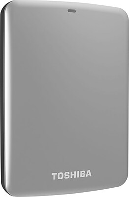 Toshiba Canvio® Connect portable hard drive in silver color has 1TB capacity with USB 3.0 interface and provides transfer rate up to 5Gb/s. 8MB Drive requires speed of 5,400 RPM with 12 ms average seek time and is compatible with PC, Mac®.